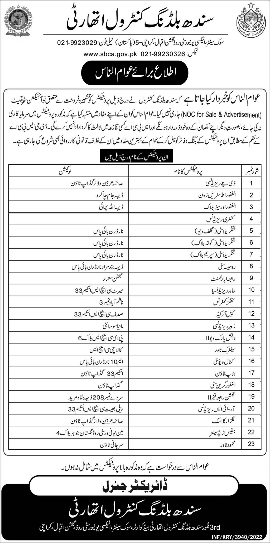 Beware! Investors, We have an updated list of illegal housing schemes in Karachi issued by Sindh Building Control Authority (SBCA). These societies are still functional in the market without obtaining a No Objection Certificate (NOC) from SBCA. The authority has made an advertisement in a newspaper to aware public about these illegal societies. The authorities strictly warned the public to refrain from any sort of sale purchase activity in the listed housing schemes. Authority also revealed that these projects are essentially sponsored by Land Mafia.